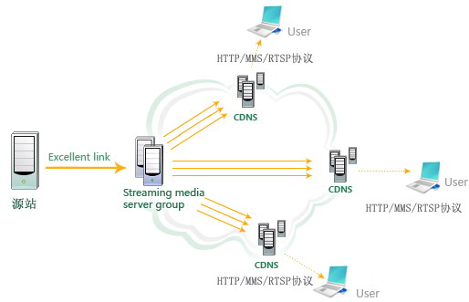 流媒体标准点播加速服务是将源站大量的流媒体内容(视频、声音和数据等)通过良好的链路传输到腾码网络流媒体专用存储设备中,并通过TenmaCDN网络本身具有的协同性能,同步分发或缓存到位于各地的TenmaCDN小网络中的专用流媒体访问服务器上,这些服务器位于各省市主要运营商网络节点。TenmaCDN网络中智能网络分配技术将终端用户对网站的请求指向响应效果最好的流媒体服务节点上,通过这些流媒体服务节点,向用户提供稳定可靠的流媒体点播服务。
